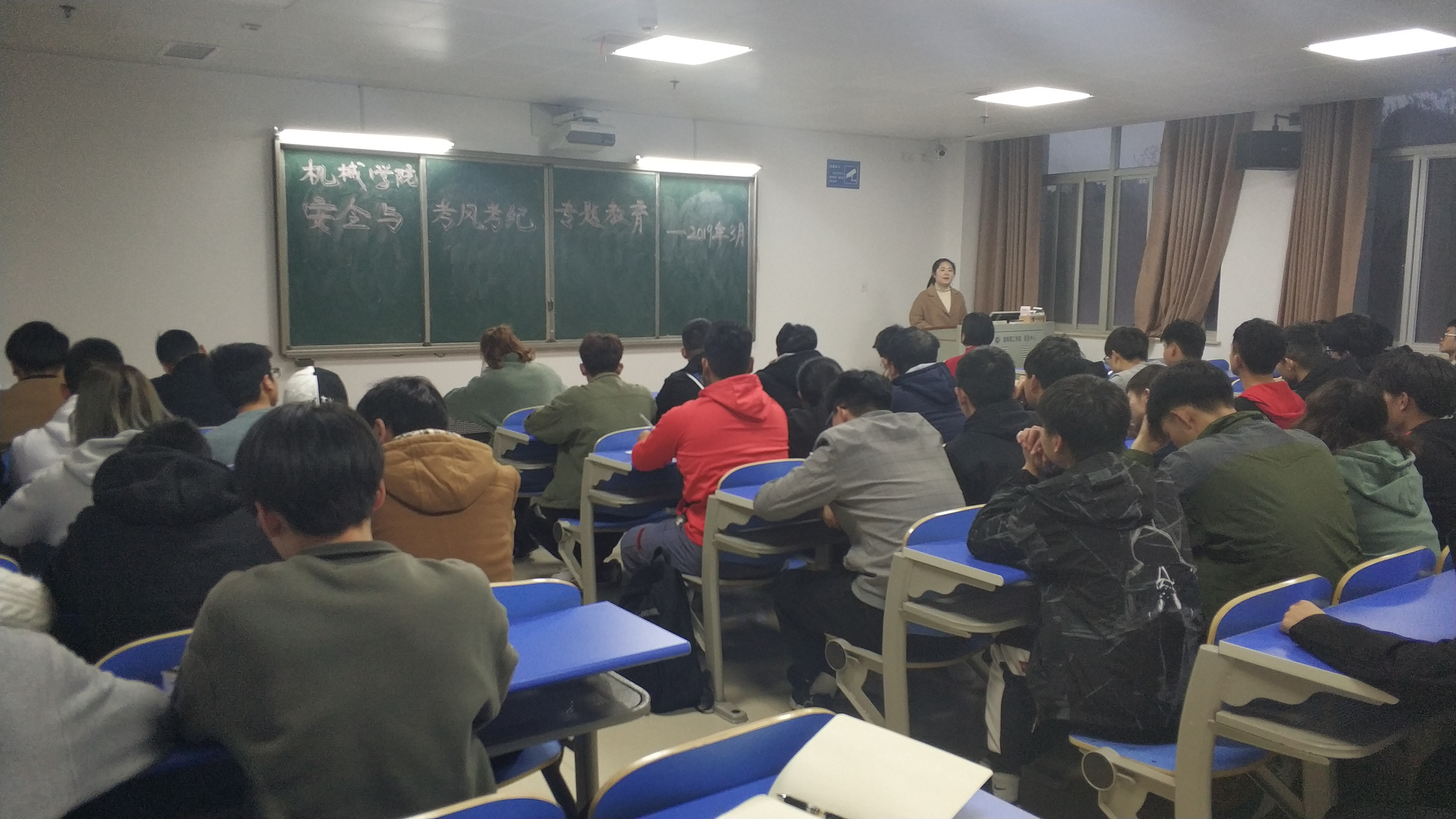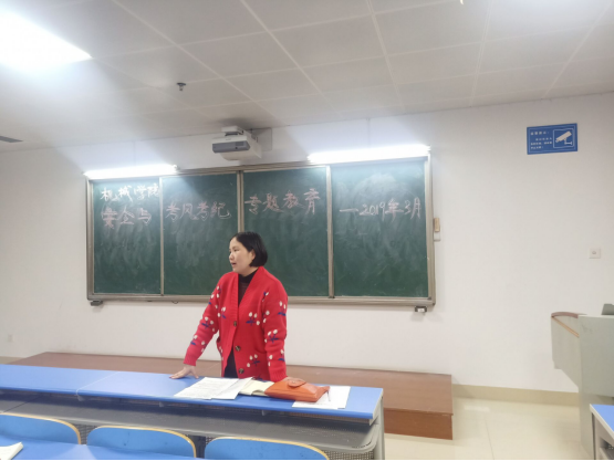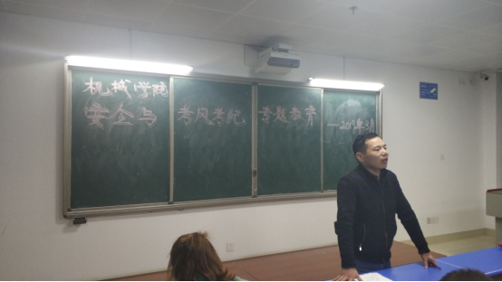 李紫薇老师讲话内容主要包括党建工作及有关毕业生的就业问题。她强调党建工作要诚信,必须实事求是,不能谎报。李老师也提及了毕业生的应聘条件,希望大家能认真地学习专业知识,成为一个有真才干、真本领的人。王子嘉老师主要强调了考风考纪的问题,针对员工考试中出现的五大问题,并提出了两点要求。她强调要加强学风建设,要求各班召开班会,为同学们营造更好的学习氛围;并希望班干部多做工作提高同学们的纪律意识。刘尘轩老师主要讲述了有关征兵及党员发展方面的问题。他简要地介绍了征兵的方式、当义务兵的福利及应征入伍后未来的规划,并支持有想法的同学来找他报名。随后,刘老师又介绍了有关本学期党员发展的注意事项。吁锤老师主要针对本期员工的寝室文明、校园文化建设等重点工作、等。吁老师要求大家学习党的十九大精神,积极开展团课。他还鼓励大家积极参加机械创新节、校园文化节、暑期三下乡等活动,以此来提高自己。此外,吁老师还提及了同学们的心理健康问题,希望大家多多关注身边同学们的心理健康。蔡奕老师最后发表讲话重点强调安全,并用历年来安全事故作为典型案例来告诫同学们要随时注意安全;她要求班委要着重加强班级建设,增强班级凝聚力;强调员工干部要学会合理安排时间,注重能力的培养。